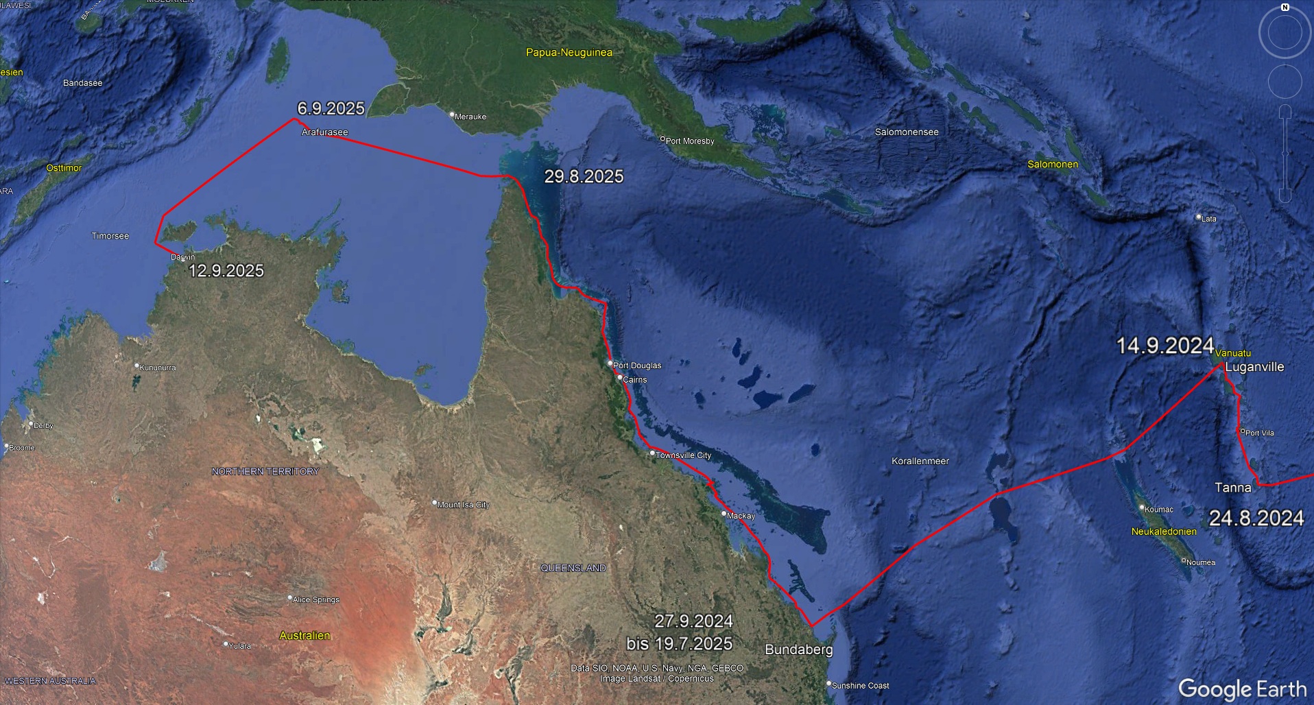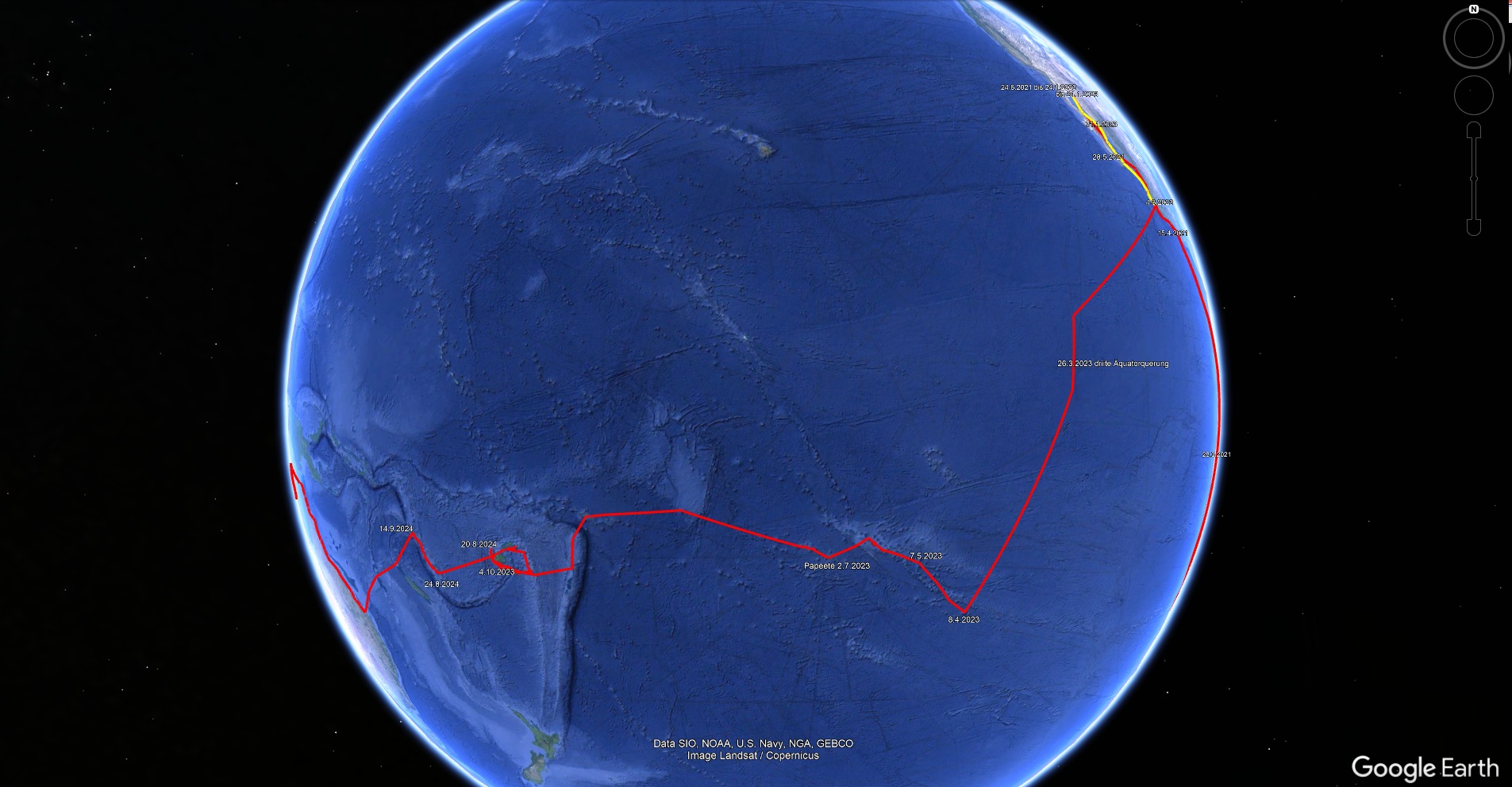 Start Stavoren/NL bis KapverdenKapverden bis BrasilienBrasilien bis ArgentinienVictoria B.A. bis Isla de los Estados/FeuerlandIsla de los Estados bis Puerto EdenPuerto Eden bis ValdiviaValdivia bis AcapulcoAcapulco bis La PazLa Paz bis Puerto PeñascoPuerto Peñasco bis Bara de Navidad (gelb)Bara de Navida bis Gambier IslandsGambier bis Bora BoraBora Bora bis Vuda Marina FidschiFidschi Runde 2024Vuda Marina Fidschi bis Bundaberg AustralienAlomas Weg durch den PazifikAuf dem Weg von Bundaberg nach Indonesien kollidieren wir am 6.9.2025 mit einem unmarkierten Fischernetz. Wir segeln mit defektem Motor nach Darwin.